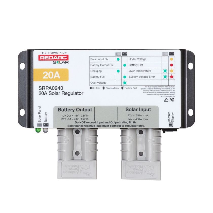 The REDARC 20A Solar Regulator ensures the correct charge is supplied safely and efficiently to charge an auxiliary battery. Available with Andersonâ„¢ SBâ„¢50 connectors.