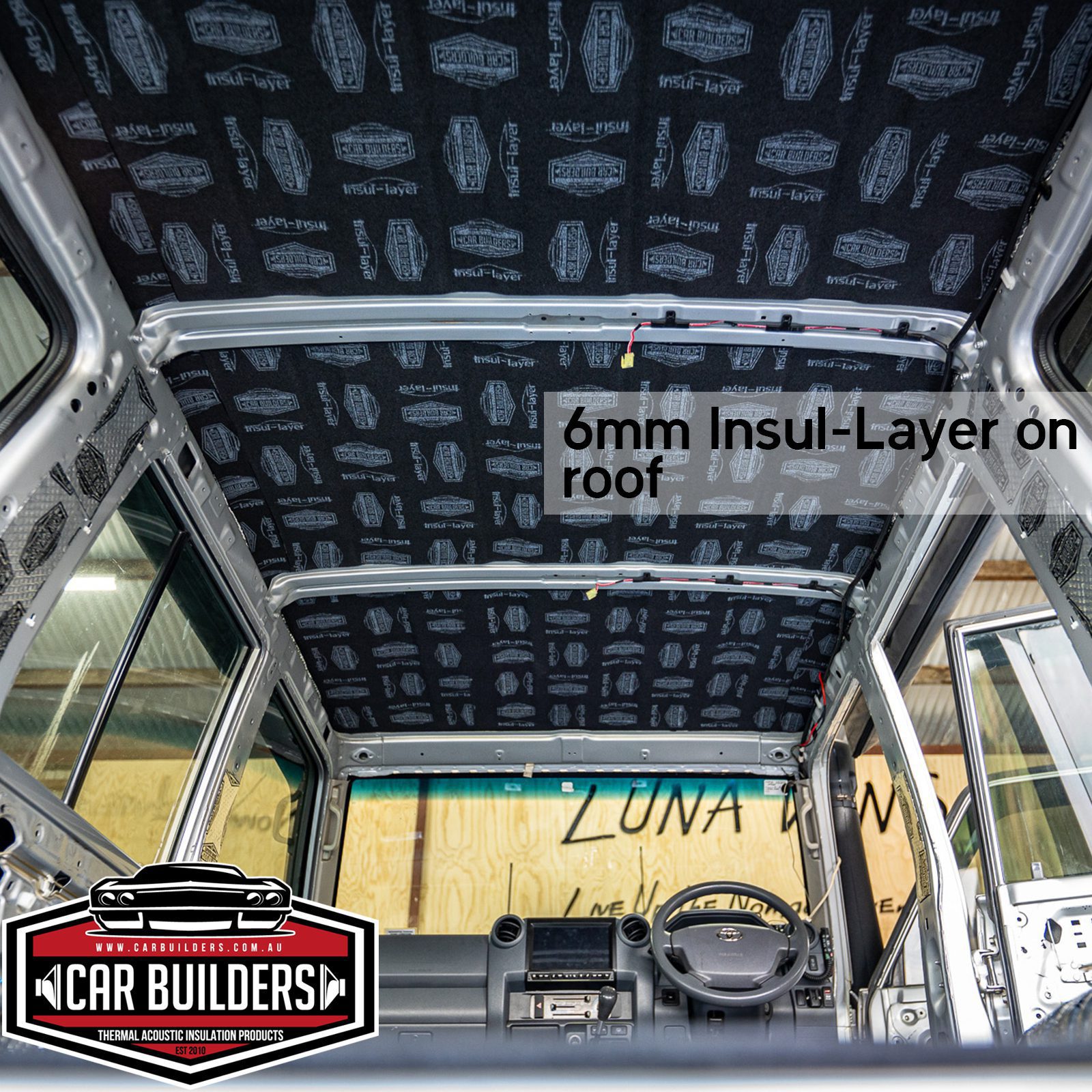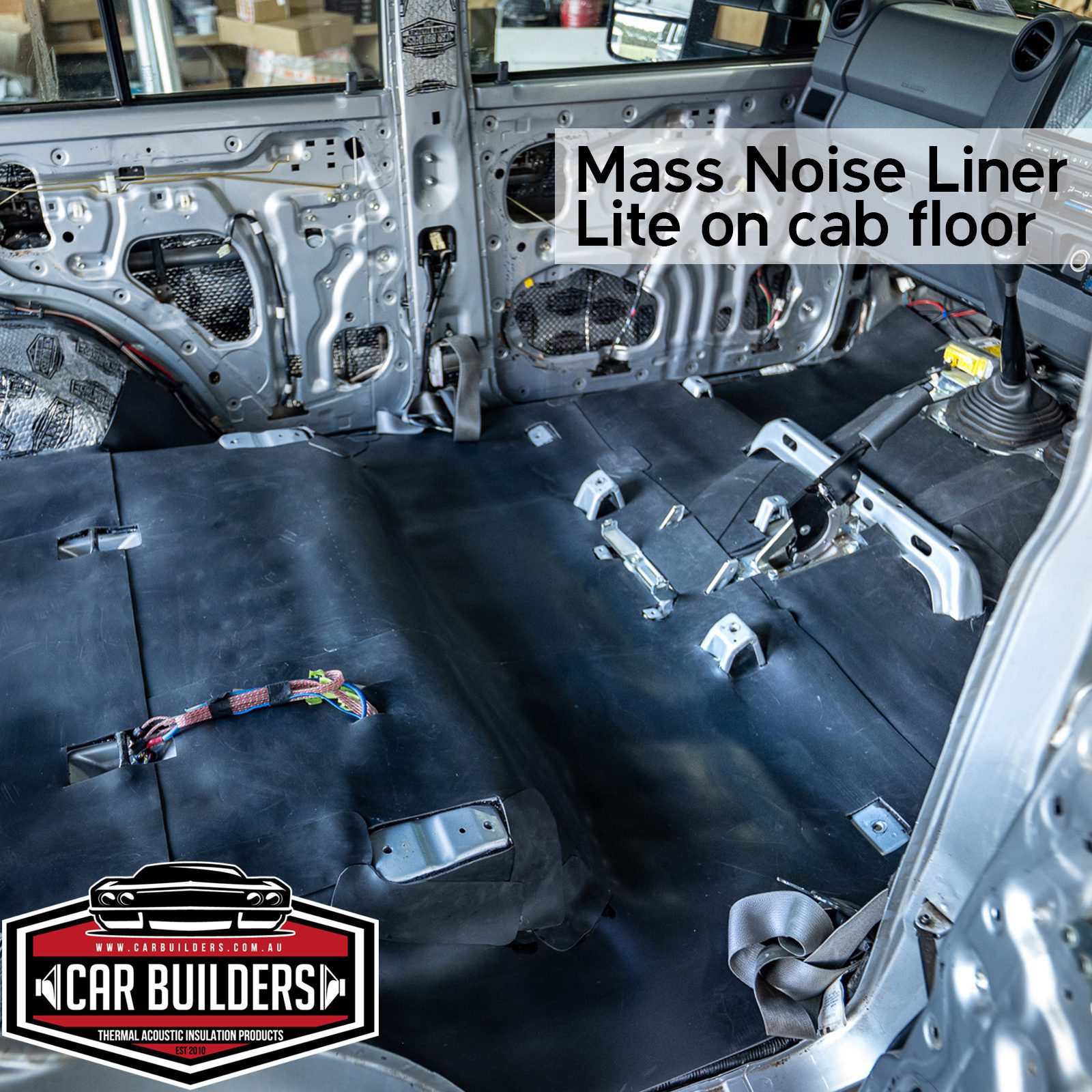 - 4 x Sheets (4.5 sq/m) Mass Noise Liner Lite – 2 in 1 closed cell thermal water proof underlay with the addition of a heavy weight mass loaded vinyl, install in carpet area up to the rear cargo area. Note carpet gets installed directly ontop of this product.