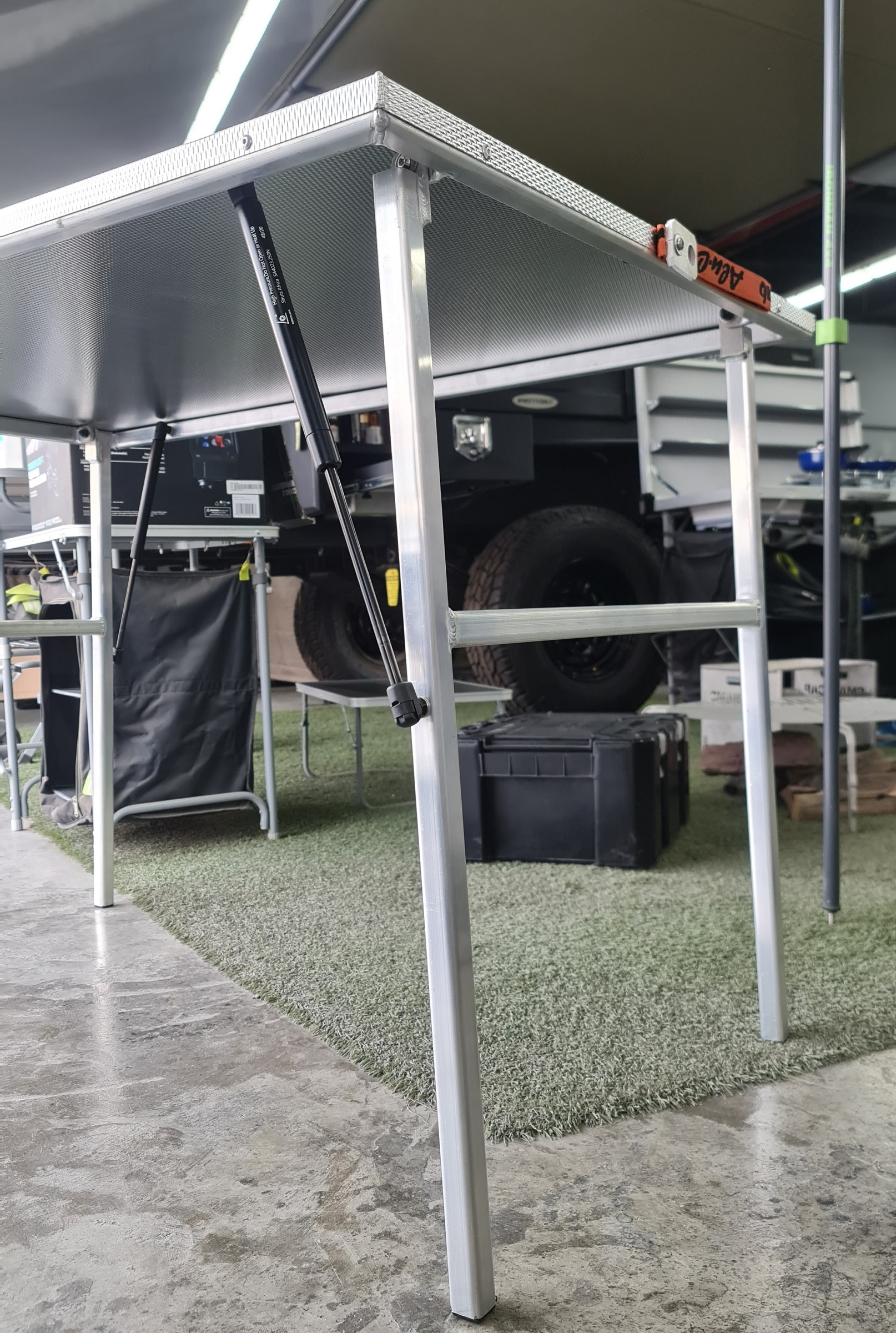 Built from a strong aluminium frame with legs that jump into position via gas struts it almost eliminates the effort to set up. The table top is made from rigidised aluminium that helps to prevent scratching. It’s a must have product for all campers!