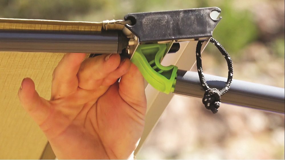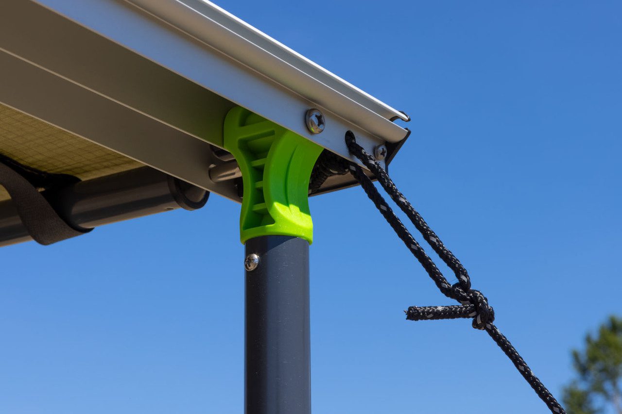 The awning features, uprated cam-lock telescopic uprights and supports, flexible nylon joints to allow for wind movement without damaging the track system, and velcro pull over clamps for quick and easy unraveling.