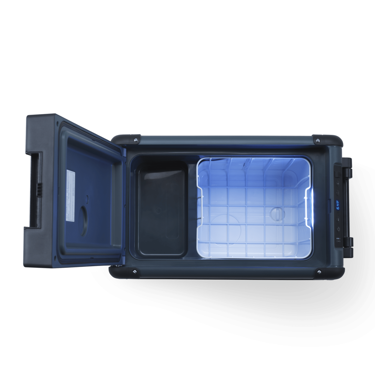 This reliable powered cooler allows you to bring more of the food and drink you love, wherever you go. Its robust design is built for tough outdoor use. Featuring a smartphone app to control the interior temperature, ergonomic foldable handles for carrying, and a digital display, this small powered cooler is perfect for your next weekend adventure.