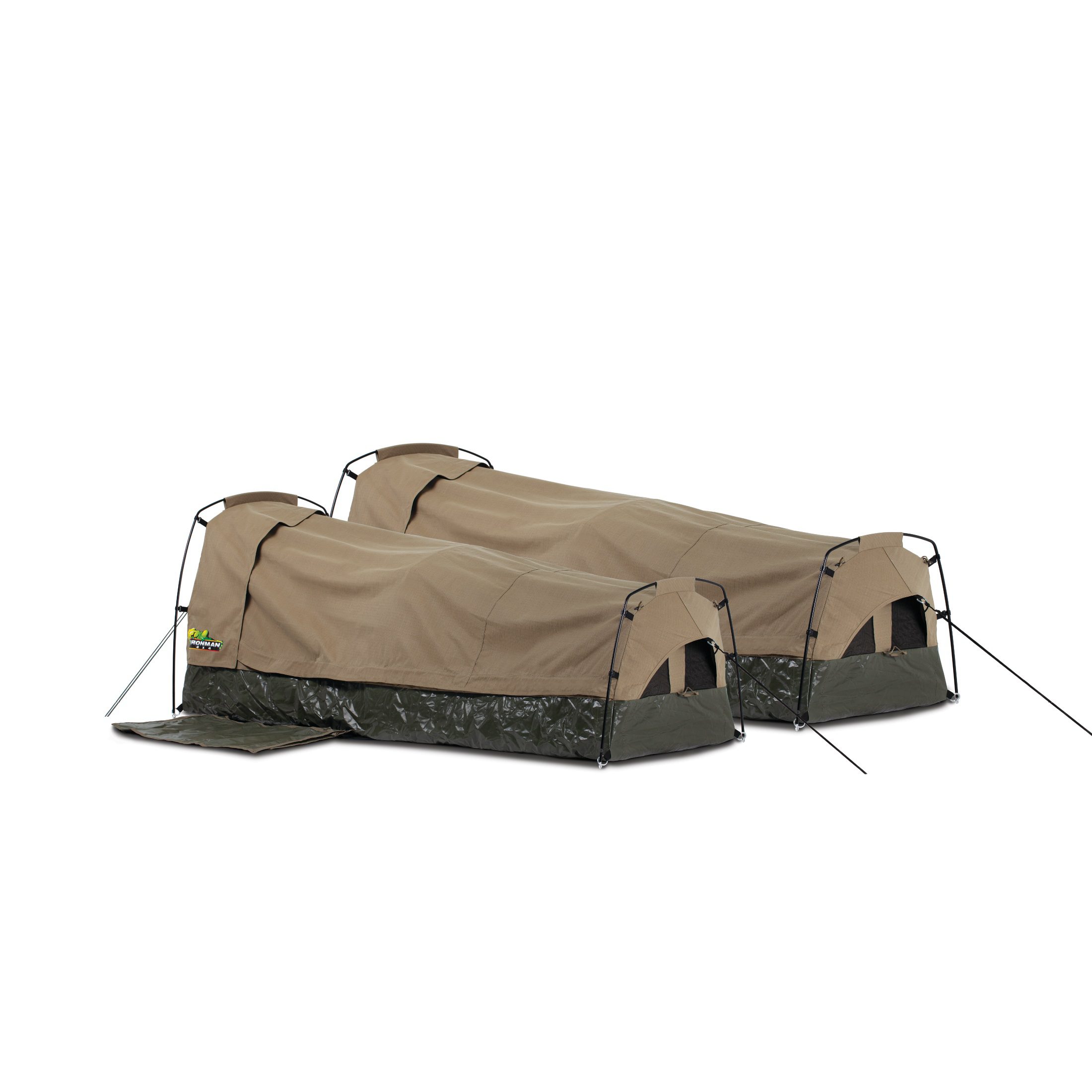 An easy solution to accommodation ‘on the run’ the swag has a long history in Australia – even if your campsite is not by a billabong! This single dome, heavy duty version is manufactured in 320 gsm ripstop canvas, includes insect mesh protection, lightweight alloy poles, a 7cm high density mattress and heavy duty carry bag. This double swag will comfortably sleep two.
