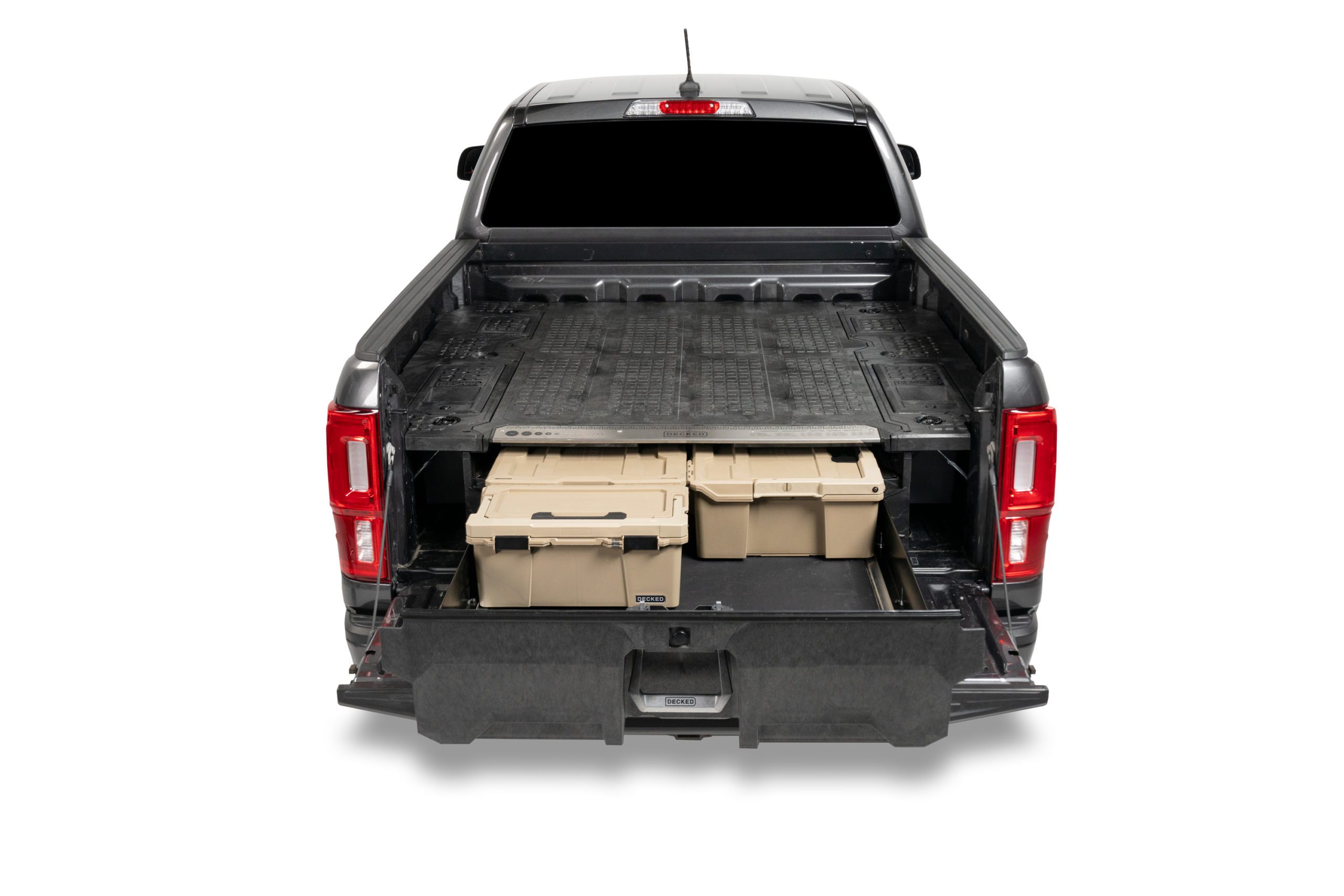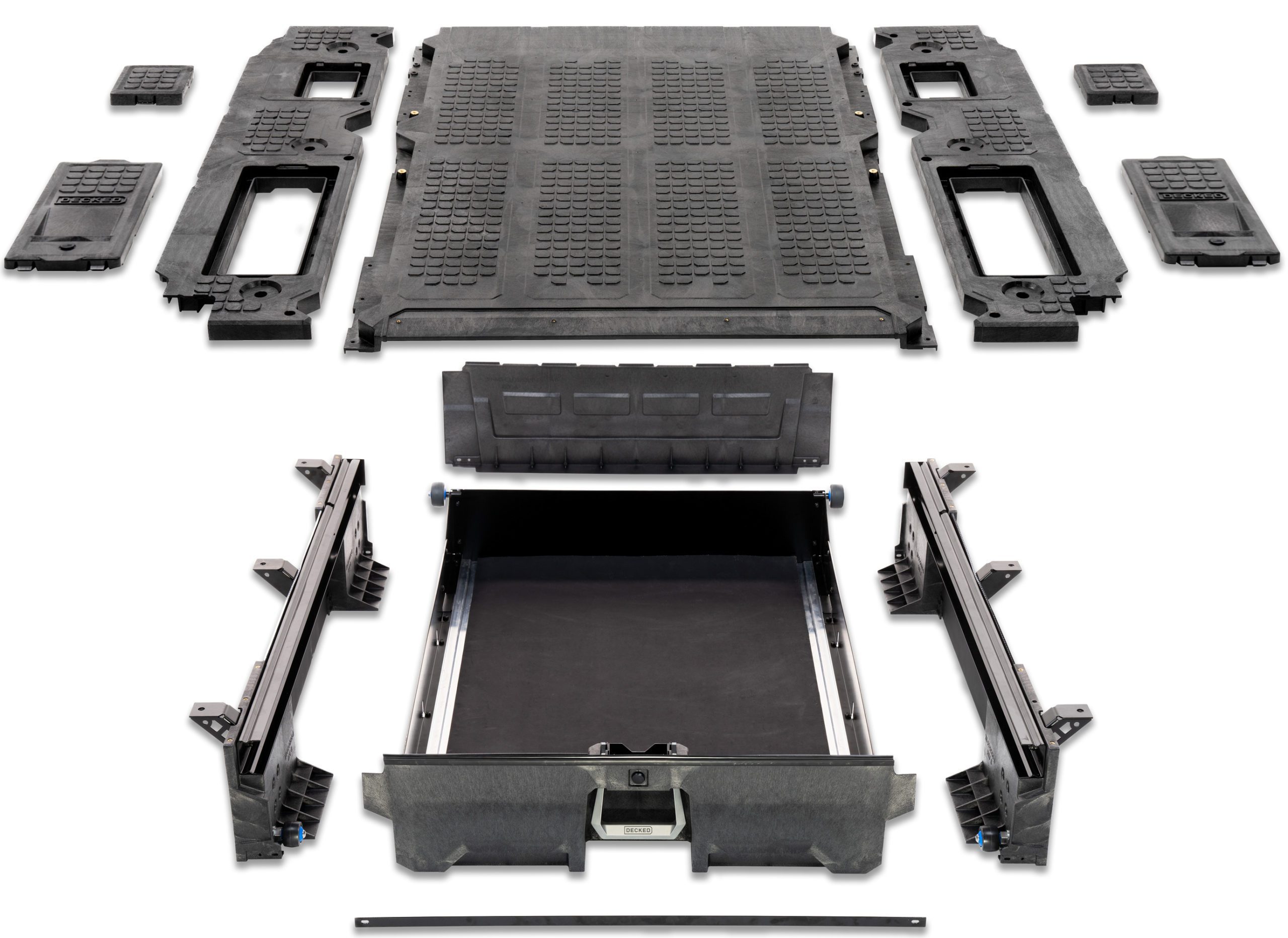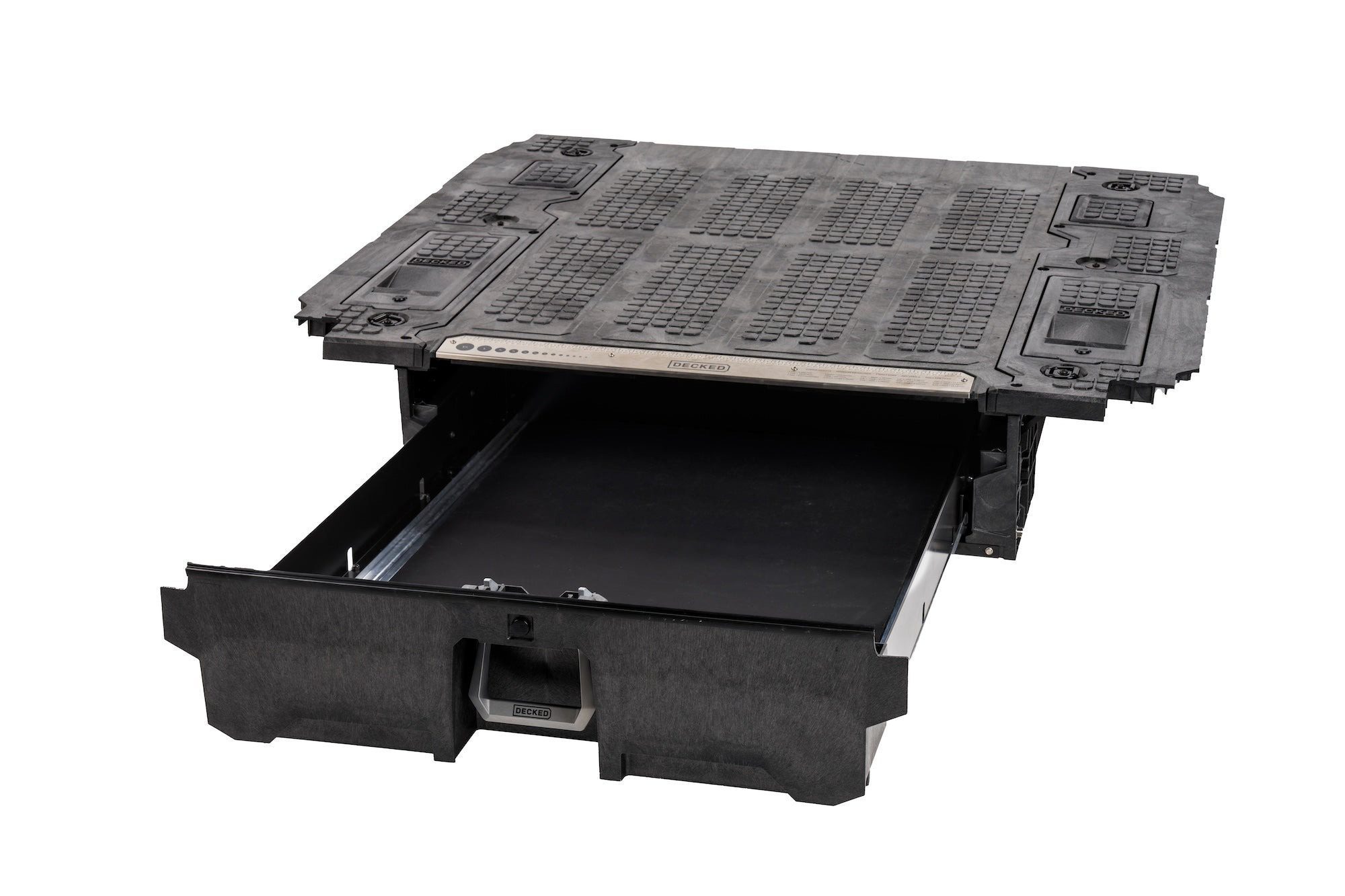 Featuring a highly adaptable single drawer with a massive 180 kg capacity, the DECKED midsize Drawer System combines weatherproof, lockable, ultra-secure storage with a 454 kg payload-rated, D-ring tie-down equipped deck for unparalleled versatility.