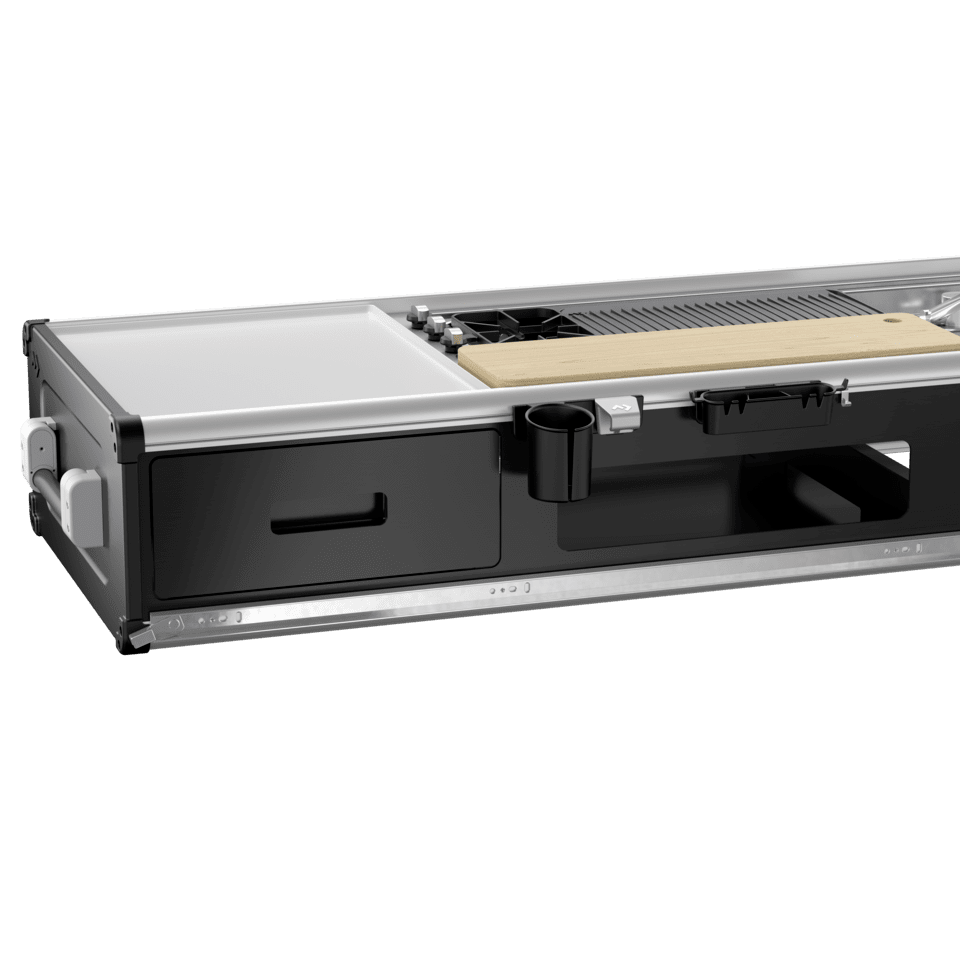 Not only does the Dometic Slide Out Kitchen save valuable space, but its telescopic runners also make it quick and easy to pull-out and stow away after use. It provides all the kitchen essentials: a sink, double-side access storage, three-burner cooktop, and a chopping board. Various additional features can be added such as a bottle opener, cup and utensil holders. The kitchen’s modular aluminium construction makes it lighter, while a generous amount of built-in storage keeps dining and cooking equipment safe and secure. Easy to install on most RVs thanks to its simple three-step installation method, the Small Slide Out Kitchen takes cooking outdoors to new levels of convenience!