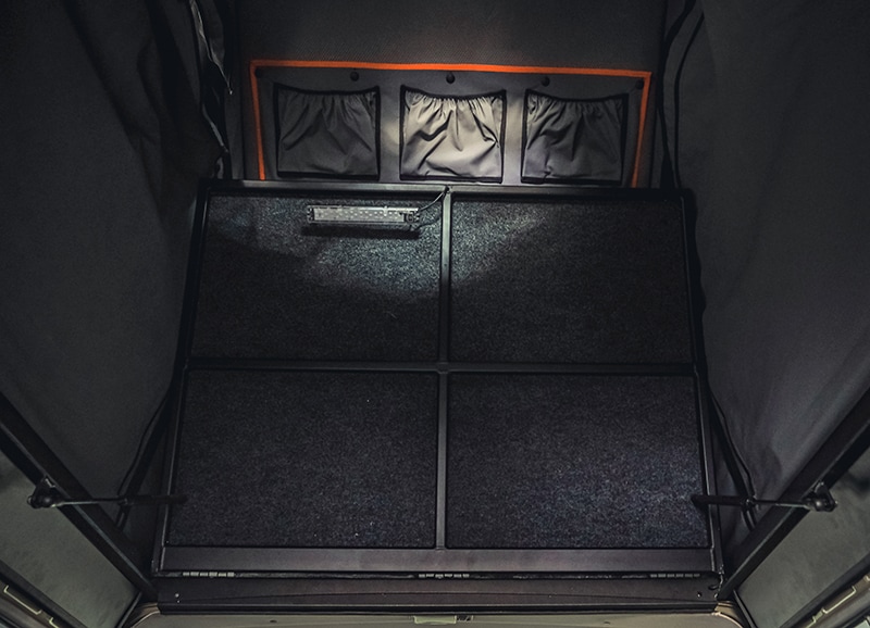 The THOR roof takes seconds to unlatch and open and can also be closed with your bedding in place. Solar panels and roof trays can be added to the roof, however be mindful of weight and placement of products as additional weight will make opening of your roof more difficult.