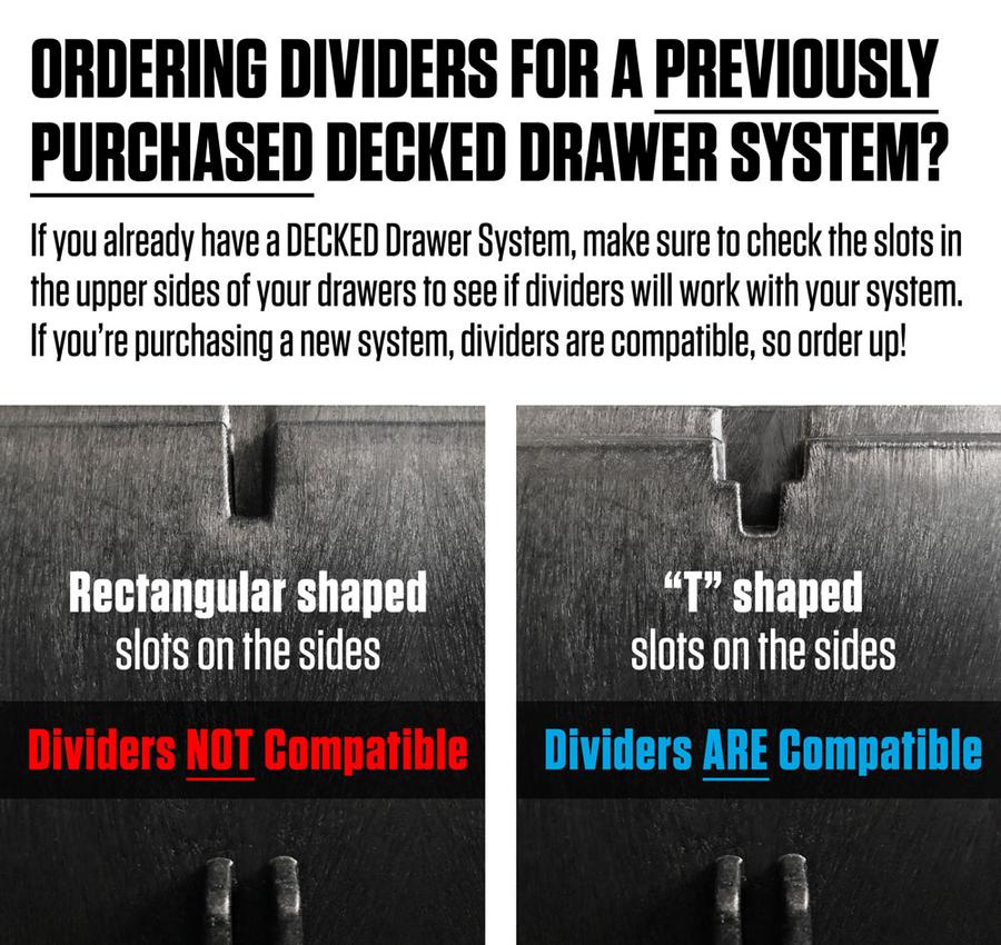 This divider combo includes two narrow Drawer Dividers (fits narrow midsize System Drawer only) and two wide Drawer Dividers (fits wide midsize System Drawer). Midsize narrow drawer dividers are not compatible with full-size DECKED systems or cargo van systems.