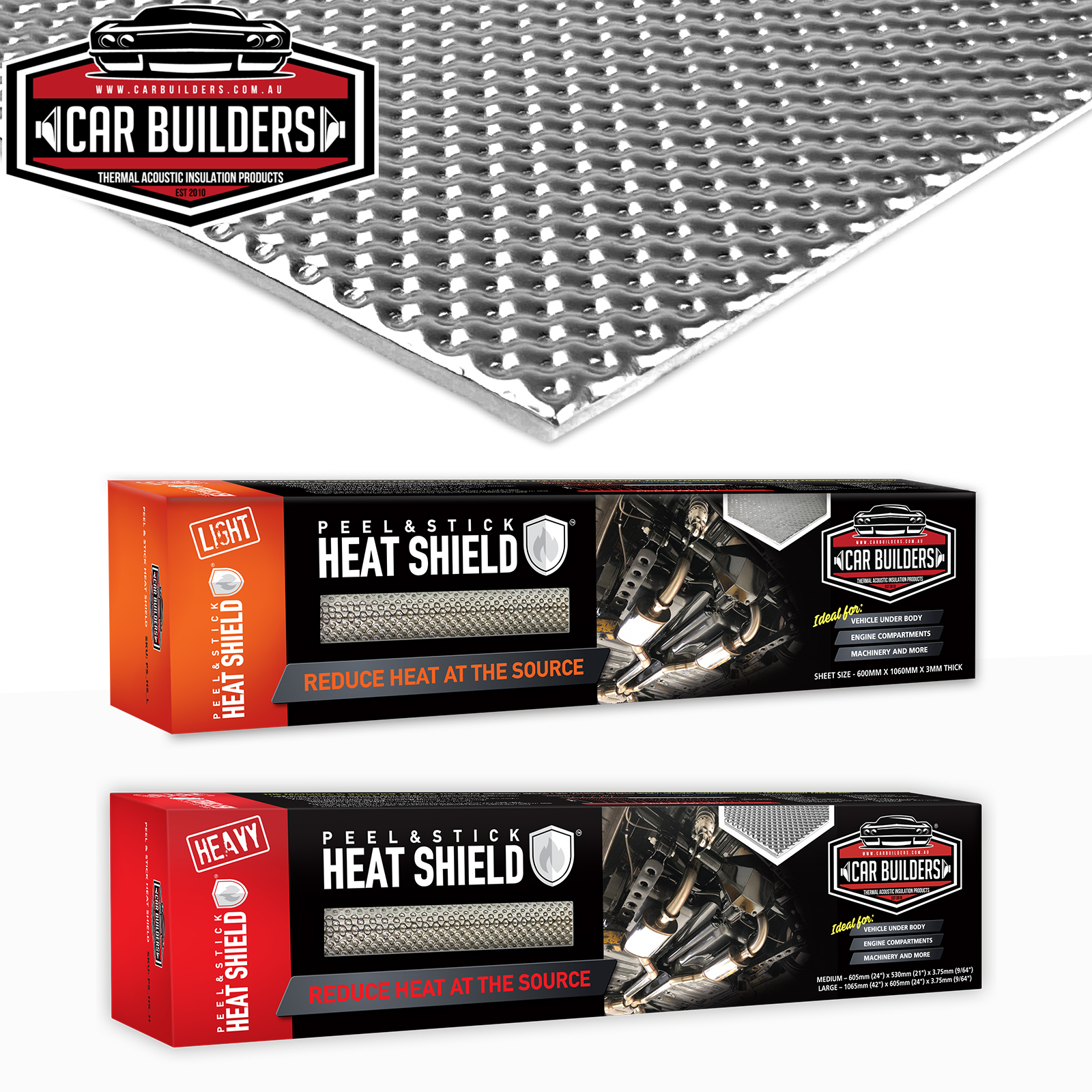 Car Builders Peel & Stick Heat Shield pressure sensitive adhesive makes these heat shields easy and versatile to install, particularly in tight spaces. It is widely used as a thermal barrier in many industries and works effectively to block heat around fuel tanks/systems, tunnel shields, floor pans, exhaust systems, body shields, transmissions, fluid lines and to protect non ferrous materials. Constructed from a needle punched fibreglass with a polyester core and durable aluminium face that comes in two thicknesses. The product has been oven test for 30 hours with no failure at 475ºF (246ºC).