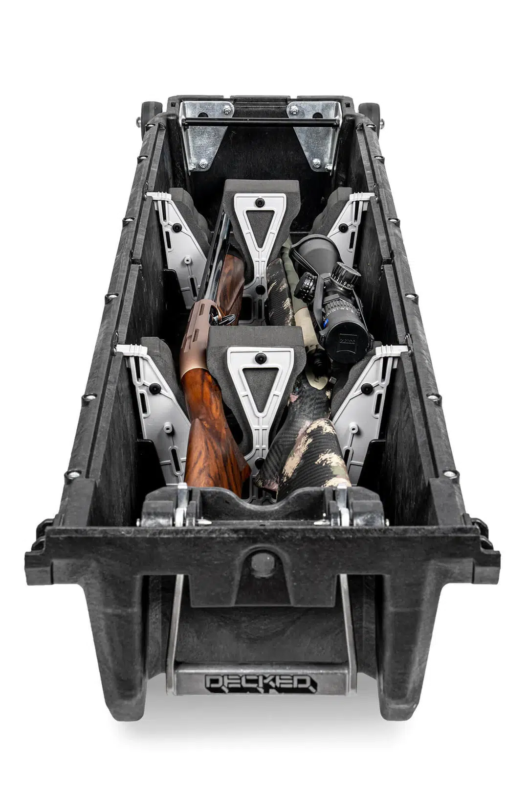 100% MADE IN USA. Piecekeepers include two foam-backed, molded resin dividers for transporting shotguns and rifles securely in your DECKED Drawer System. They offer secure, padded cradles that grip the stock and barrel for convenient, easy-to-remove-and-replace access to firearms.
