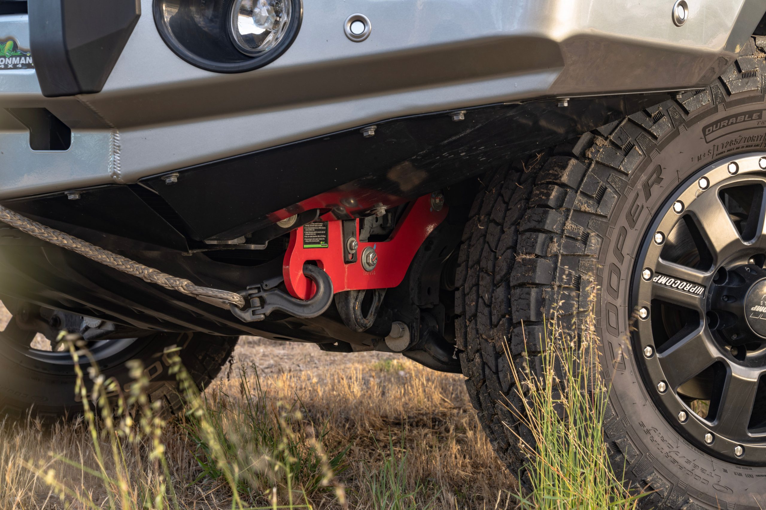 Powder-coated red, the Rated Recovery Points are easy to identify, even when covered in dirt and mud.