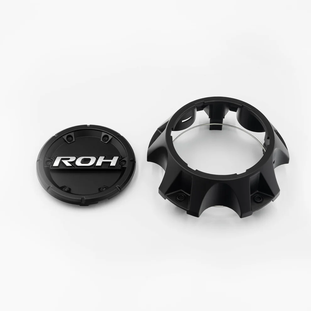 ROH Wheel Center Cap designed for 5-stud wheels with a 150mm bolt pattern, specifically suited for vehicles like the LandCruiser 70 and 200 series. It is a matt black, high-profile, 2-piece cap.